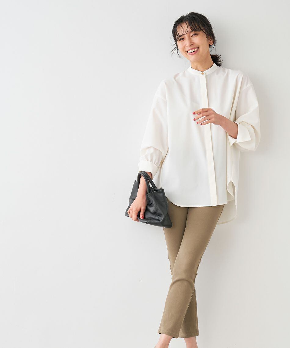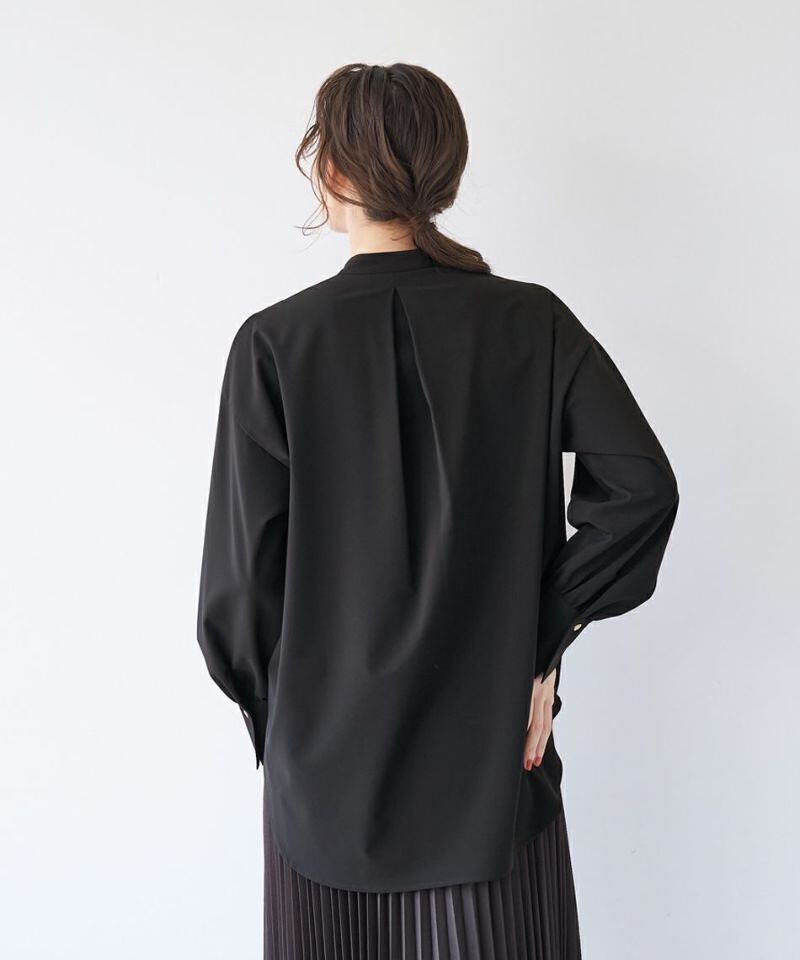 中厚手のストレッチポリエステル製のシャツ。スタンドカラーと幅広の袖口が特徴です。 接触冷感、抗菌防臭、UVカット、防シワなどの機能があり、作業着としても使えます。 同素材のパンツとのセットアップもおすすめです。